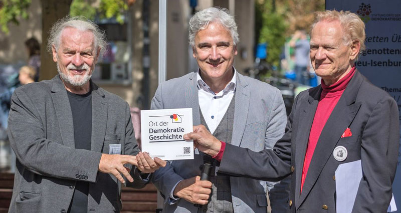 Hier wurde gewählt, hier fanden Sitzungen statt, hier sprachen vom Volk gewählte Schöffen Recht. Die Stiftung „Orte Deutscher Demokratiegeschichte“ zeigt seit 2021 auf einer Deutschlandkarte solche Orte, wo sich Menschen für Freiheit, Mitbestimmung und Menschenwürde einsetzten. In Neu-Isenburg geschah das bereits ab 1702 im sog. Alten Ort rund um das Hugenottenrathaus. Die AG Stadtmarketing hat als geübte Netzwerkorganisation diesen Ort der Demokratiegeschichte bei der o.g. Stiftung zur Anerkennung eingereicht. Am Tag des offenen Denkmals wurde die Plakette offiziell auf dem Marktplatz überreicht. Die Plakette mahnt auch an, dass Demokratie in heutigen Zeiten verteidigt werden muss.